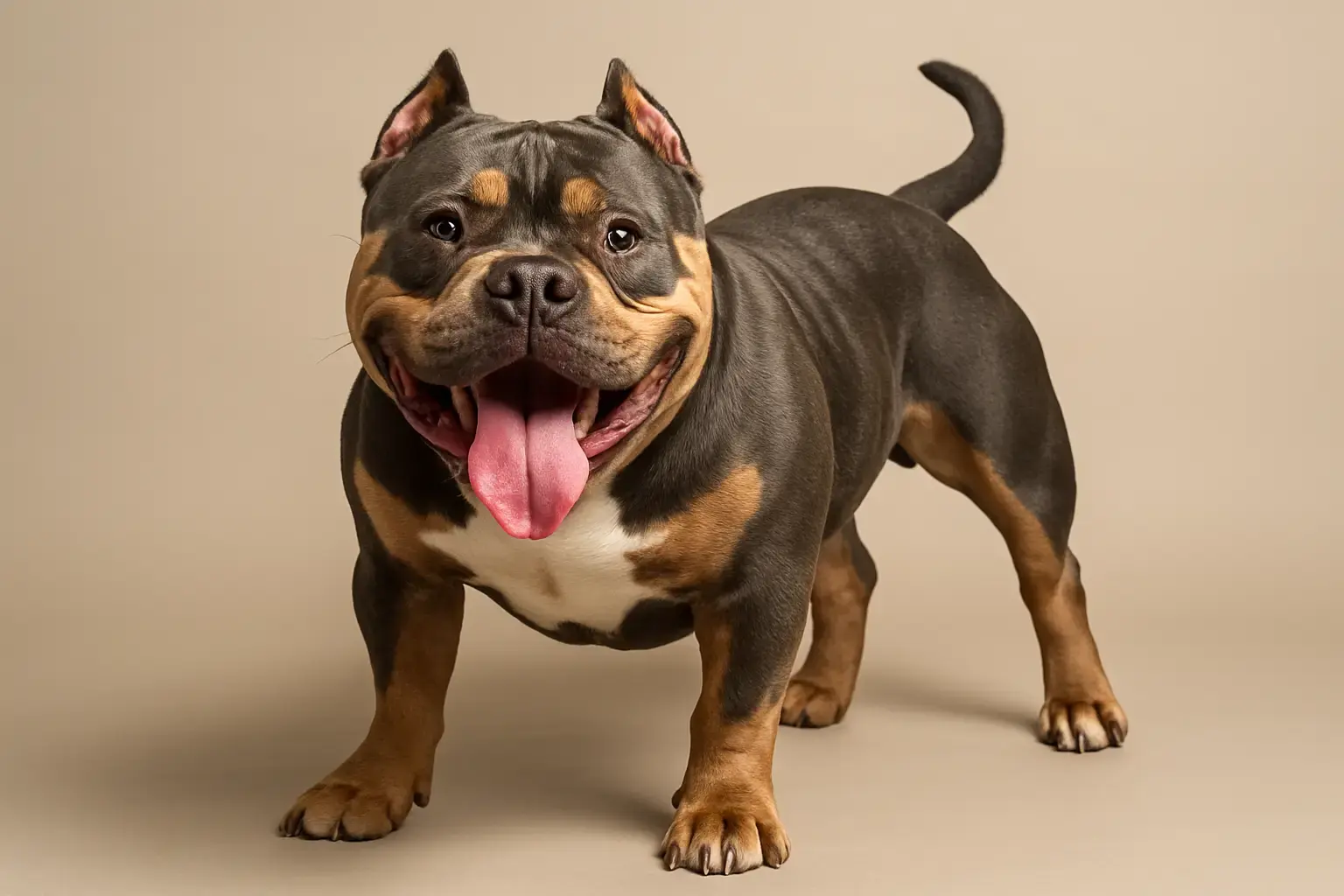 Это плотная собака с тяжелой квадратной головой, широкой мордой и мощной нижней челюстью. Телосложение атлетическое, мускулистое. Допускаются любые окрасы (черный, голубой, лиловый, палевый, шоколад, триколор в разных сочетаниях и др.), кроме мраморного (мерль). Мраморный ген связан с серьезными проблемами со здоровьем и психикой. Альбиносы также нежелательны из-за склонности к аллергиям.